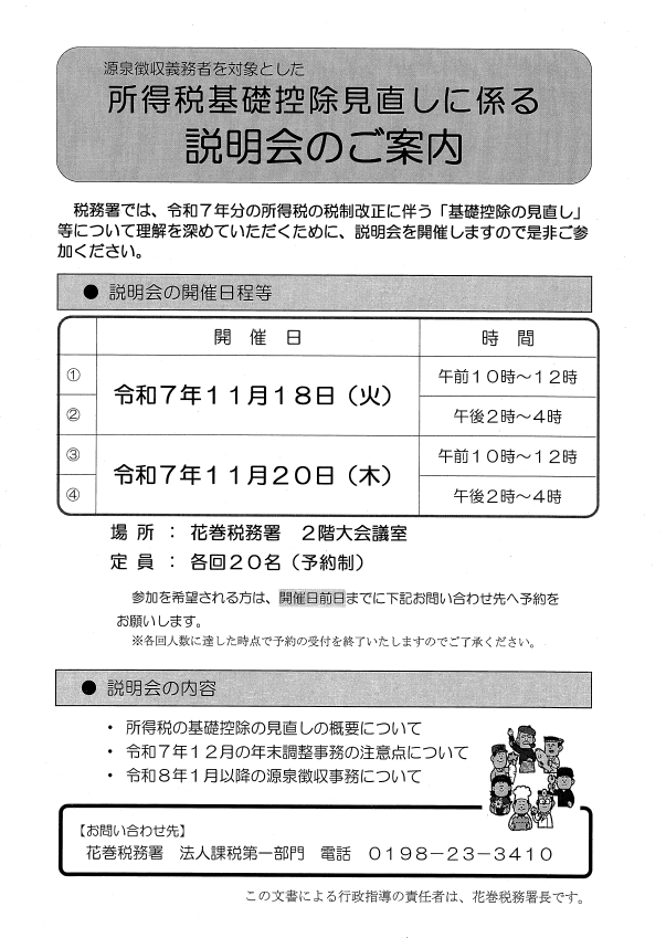 花巻税務署では、令和7年分の所得税の税制改正に伴う「基礎控除の見直し」等について理解を深めていただくために、説明会を開催します。 【日時】 11月18日(火)・11月20日(木) 両日とも 午前10時~12時 及び 午後 […]