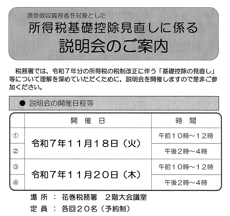 花巻税務署では、令和7年分の所得税の税制改正に伴う「基礎控除の見直し」等について理解を深めていただくために、説明会を開催します。 【日時】 11月18日(火)・11月20日(木) 両日とも 午前10時~12時 及び 午後 […]