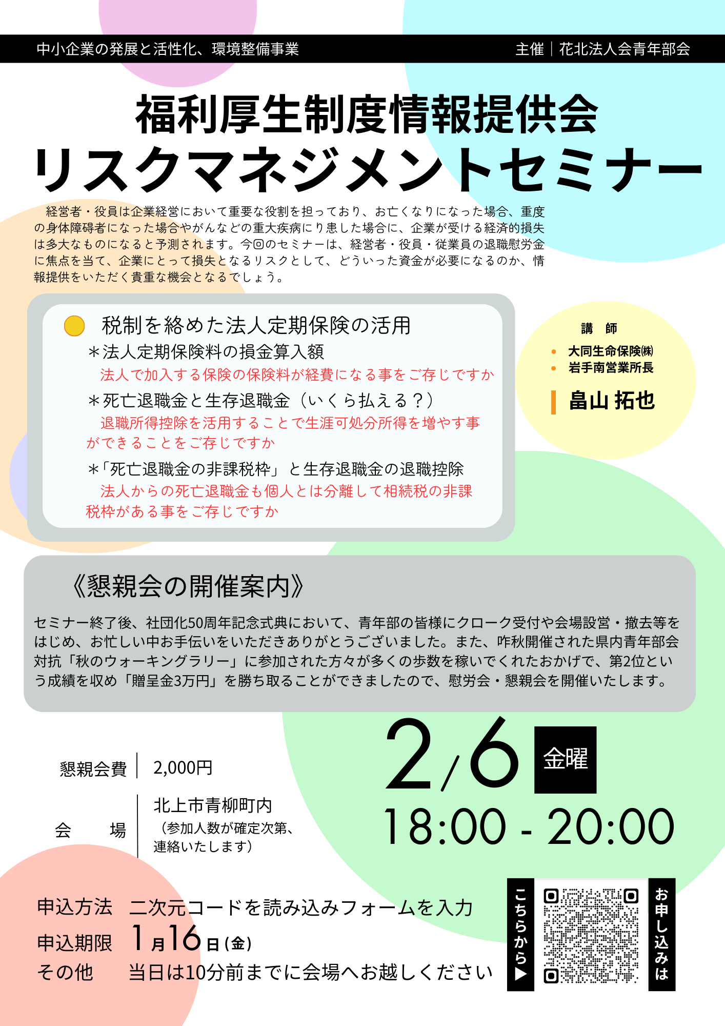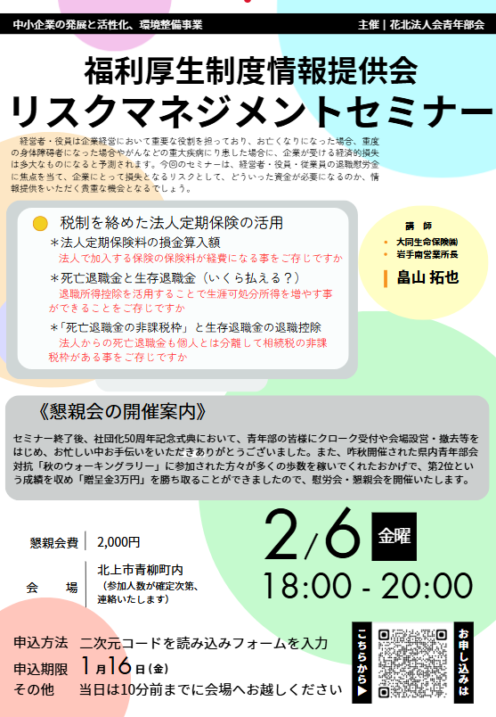 2月062026 リスクマネジメントセミナー 【参加受付中】 締切り 1月16日(金) リスクマネジメントセミナー 経営者・役員は、企業経営において需要な役割を担っていおり、お亡くなりになった場合、重度の身体障害状態になった場合やがんなどの重大疾病にり患した場合に企業が受ける経済的損失は多大なものになると予想されます。企業にとって損失となるリスクとして、どういった資金が必要になるのか。今回は役員・従業員の退職資金について講師を招き解説していただくセミナーを開催いたします。 開催日 令和8年2月6日(金) 時間 18:00~20:00 開催場所 北上市青柳町内 (参加人数確定次第、追って連絡) 参加条件 青年部会員 定員 ▲上記画像をクリックするとPDFファイルをダウンロードできます▲ お申し込みはこちら