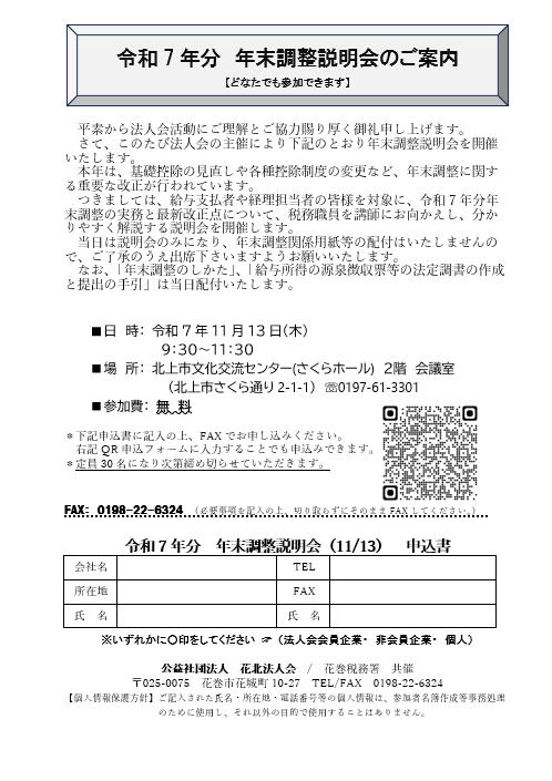 11月132025 年末調整説明会(2回目) 【参加受付中】 定員に達し次第受付終了 好評につき急遽、年末調整説明会2回目を開催いたします。 法人会主催により年末調整説明会を開催いたします。 年末調整は、給与の支払い者がその年の最後の給与を支払う際に、給与所得者の一人ひとりについて、毎月の給与や賞与の支払いの際に源泉徴収した税額の一年間の合計額と、その給与所得者の一年分の給与総額について納付すべき金額(年税額)とを比較して、その過不足を精算するものです。給与所得者にとっての確定申告に代わる大切な手続きであるといえます。源泉徴収事務に従事されている方が、年末調整事務を正しく理解し、スムーズにかつ適切に進めることを目的に勉強します。 開催日 令和7年11月13日 時間 9:30~11:30 開催場所 北上市文化交流センター(さくらホール)2階 会議室 参加条件 一般 会員 定員 30名(定員になり次第締め切らせていただきます) ▲上記画像をクリックするとPDFファイルをダウンロードできます▲ 申し込みはこちら