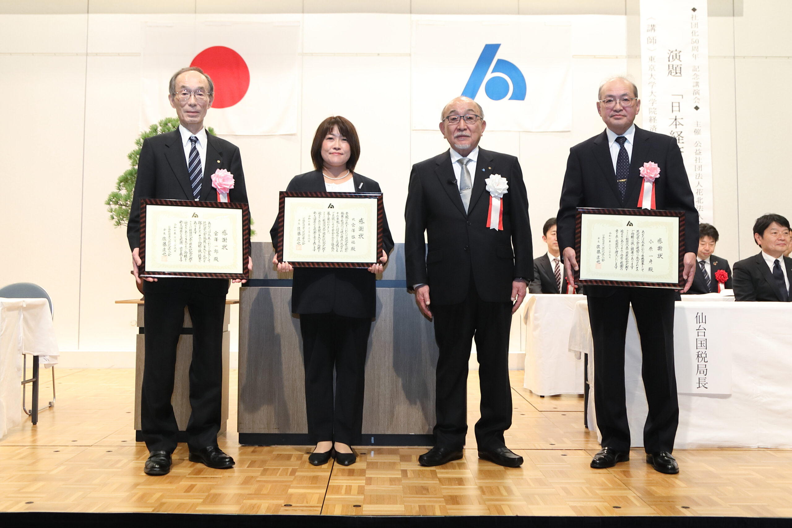 式典には仙台国税局長(佐藤賢司課税第二部次長代理出席)はじめとする税務当局の幹部や関係諸官庁並びに友誼団体・関係法人会の皆様が来賓として出席しました。佐藤直也会長のあいさつに続き、当会の運営にご尽力いただいた方々に感謝状の贈呈が行われた後、来賓を代表して仙台国税局長・岩手県知事・花巻市長・岩手県連会長の4名よりご祝辞をいただきました。