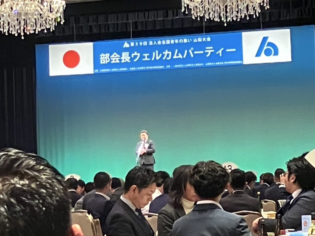 当花北法人会からは、髙橋隆紀青年部会長と千田智哉副部会長が参加、11月20日はYCC山梨文化ホールで青連協連絡協議会・租税教育プレゼンなどが行われた後、会場を甲府記念日ホテルに移し、部会長ウェルカムパーティーで懇親を深めました。